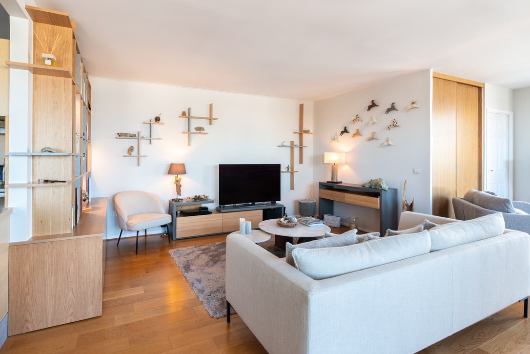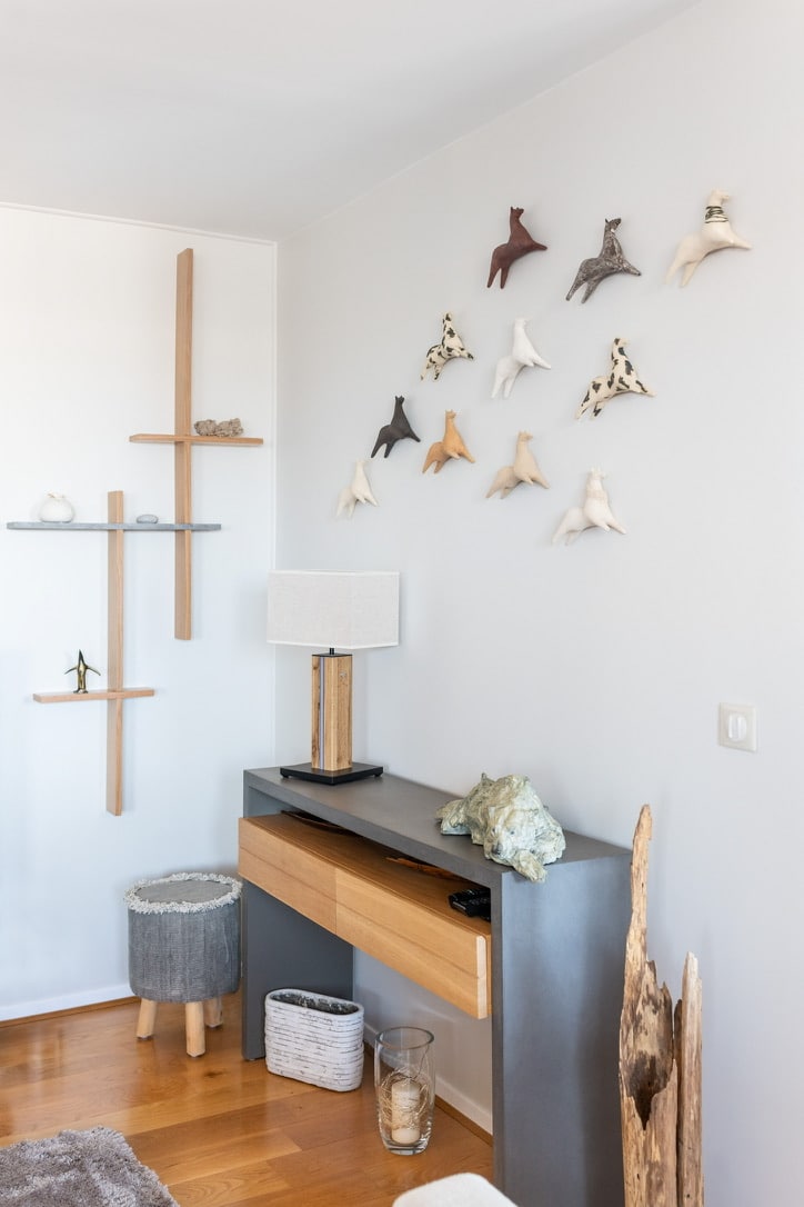 - Choix de matériaux naturels, mobilier épuré et objets décoratifs pour une ambiance chaleureuse et lumineuse