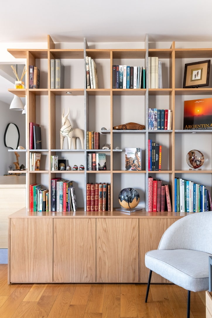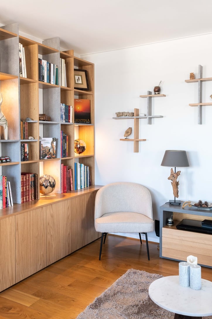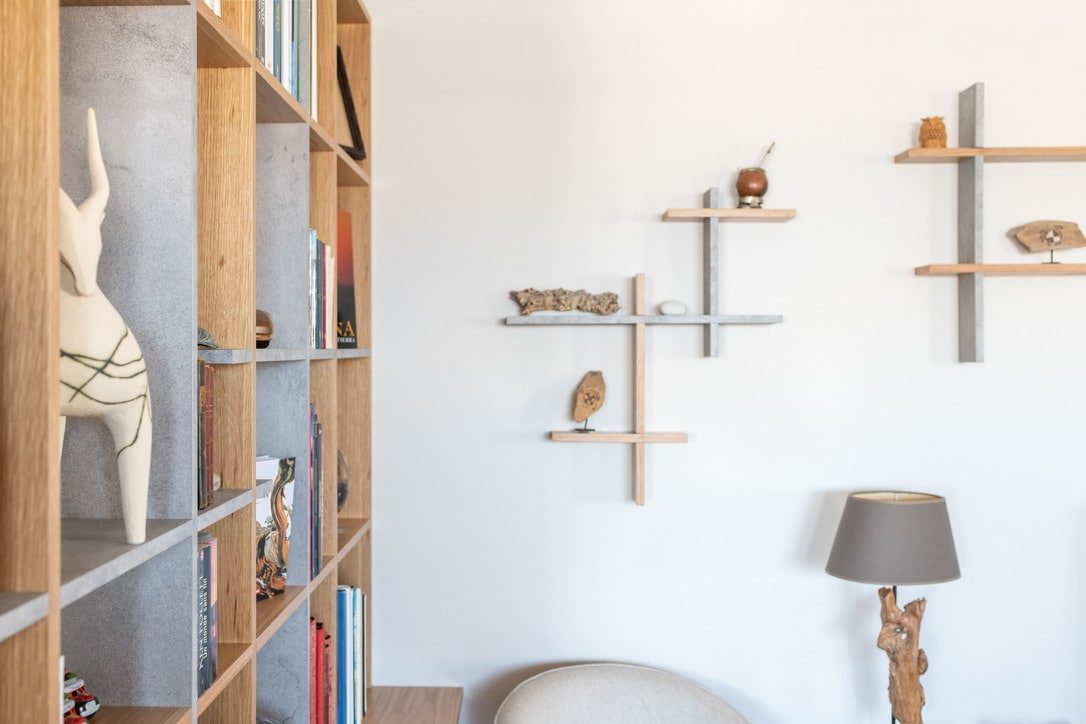 - Bibliothèque sur mesure en bois clair et béton, conçue comme un claustra décoratif et fonctionnel
